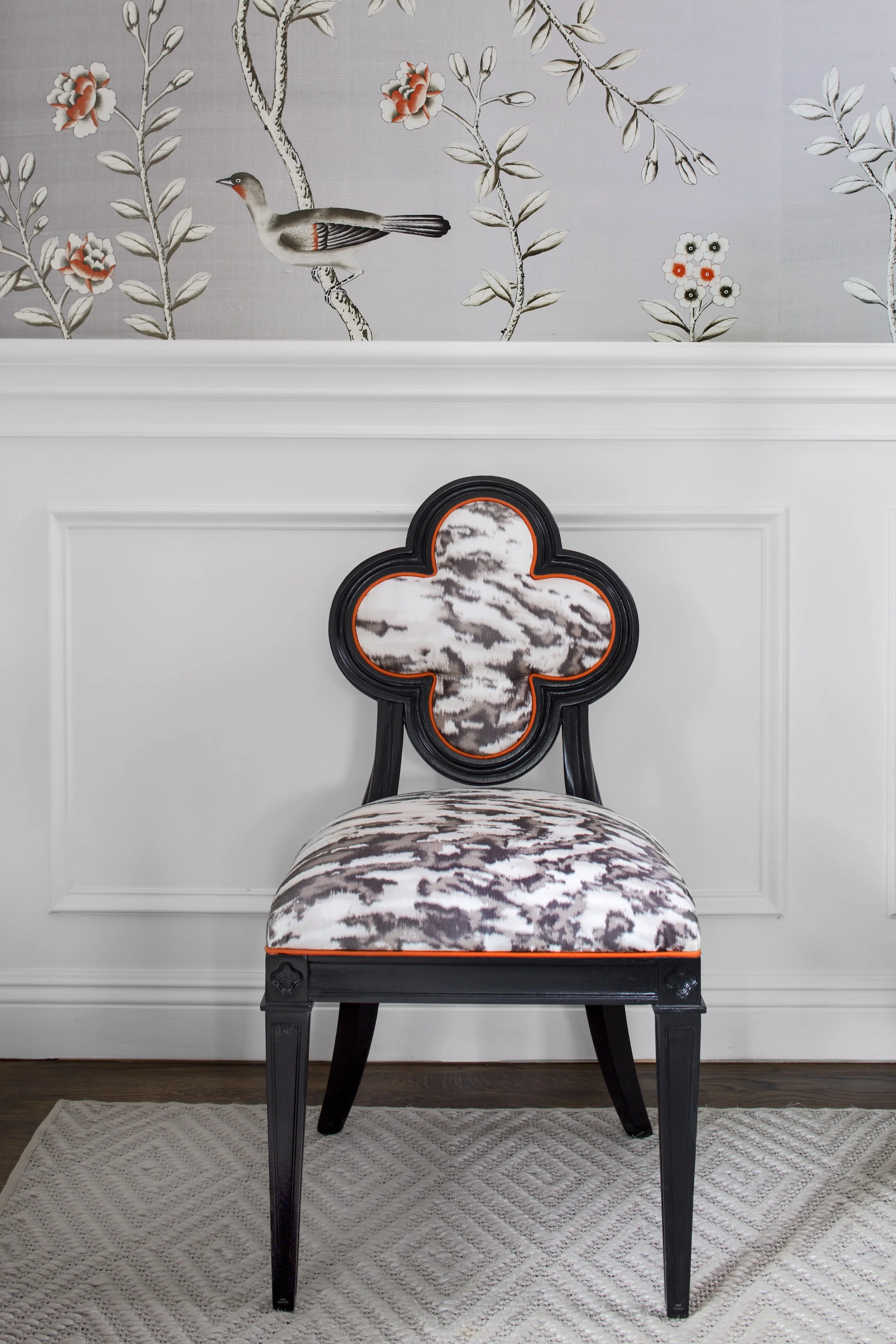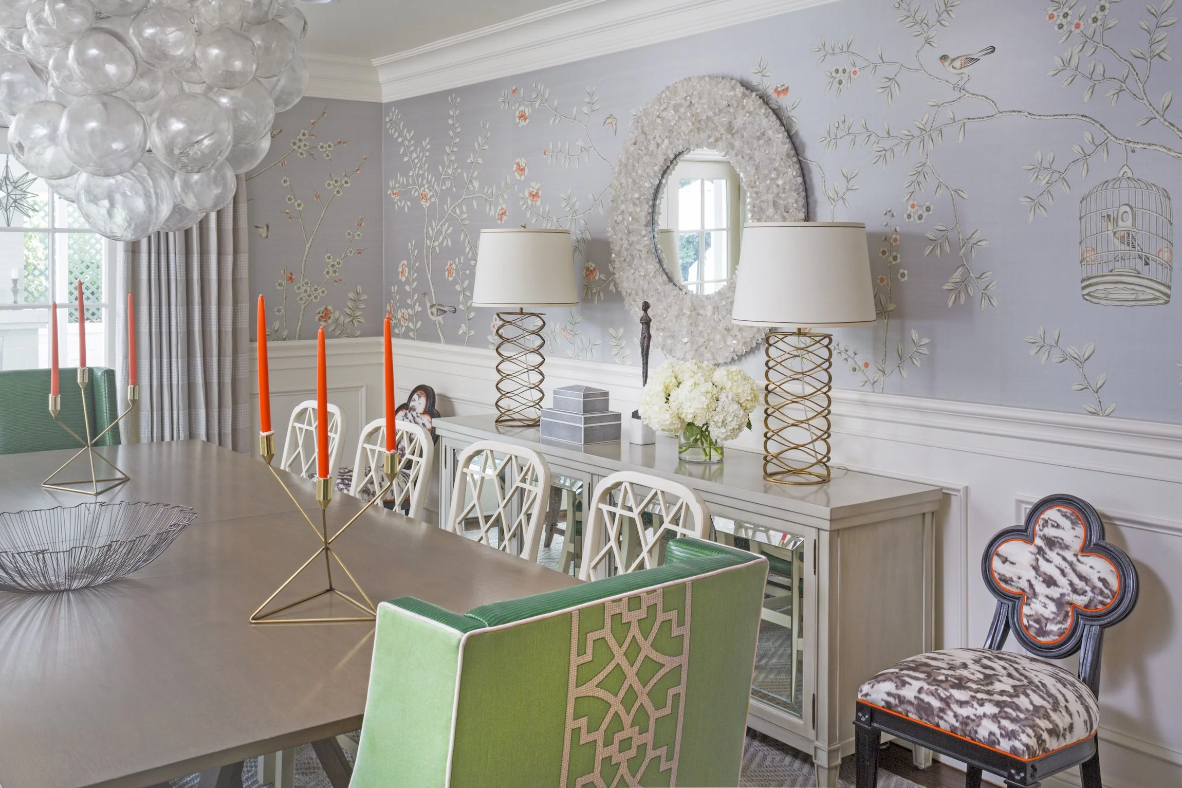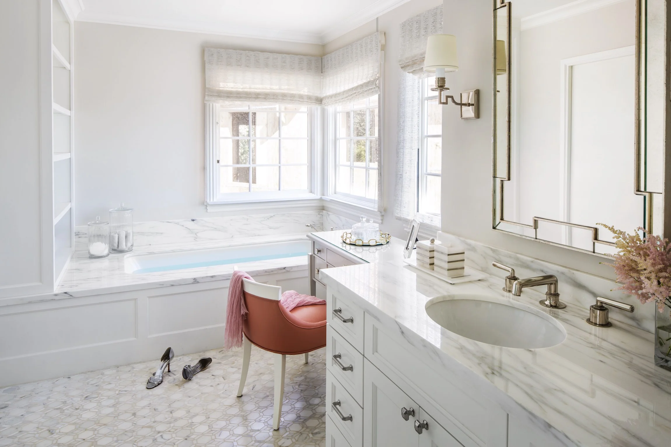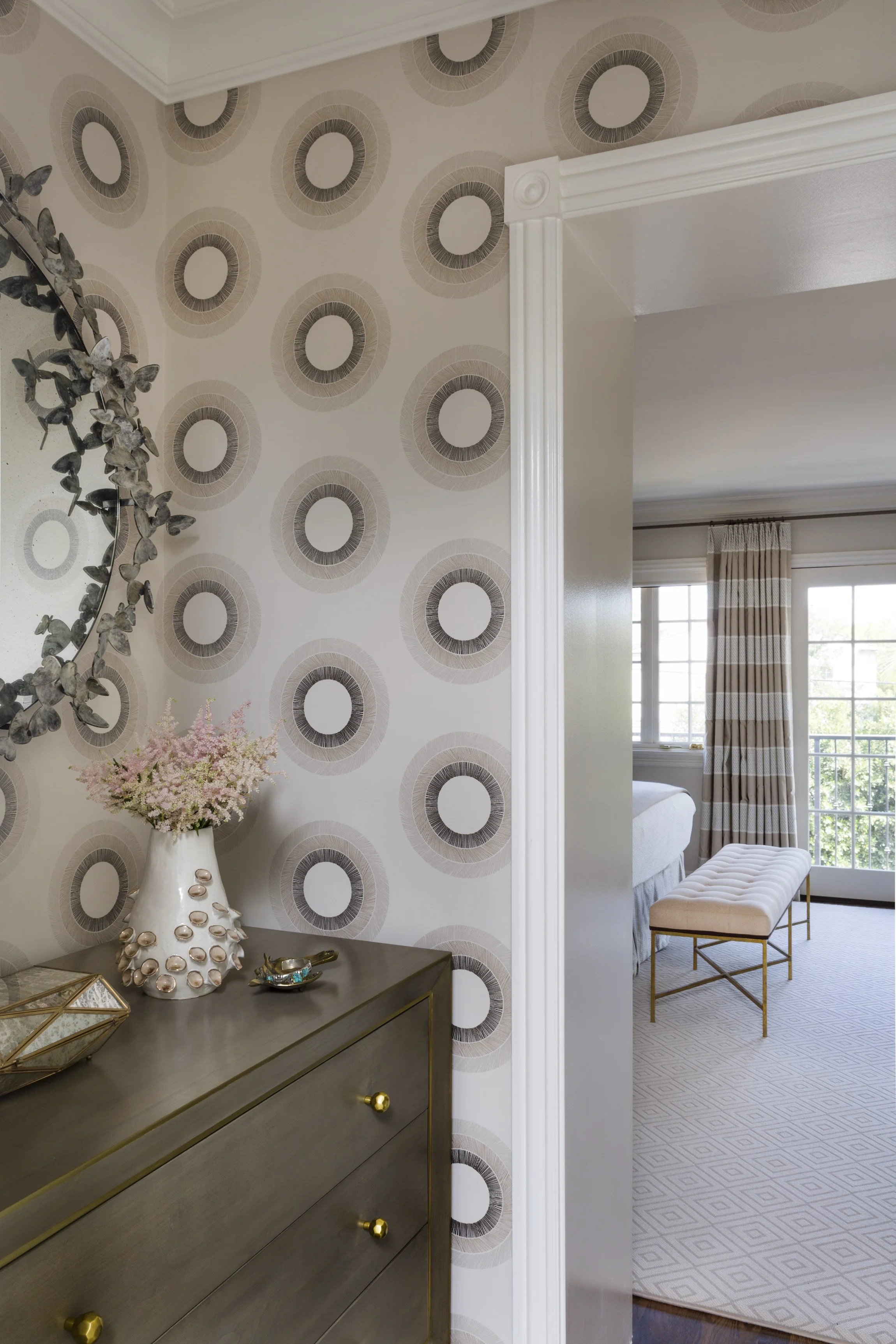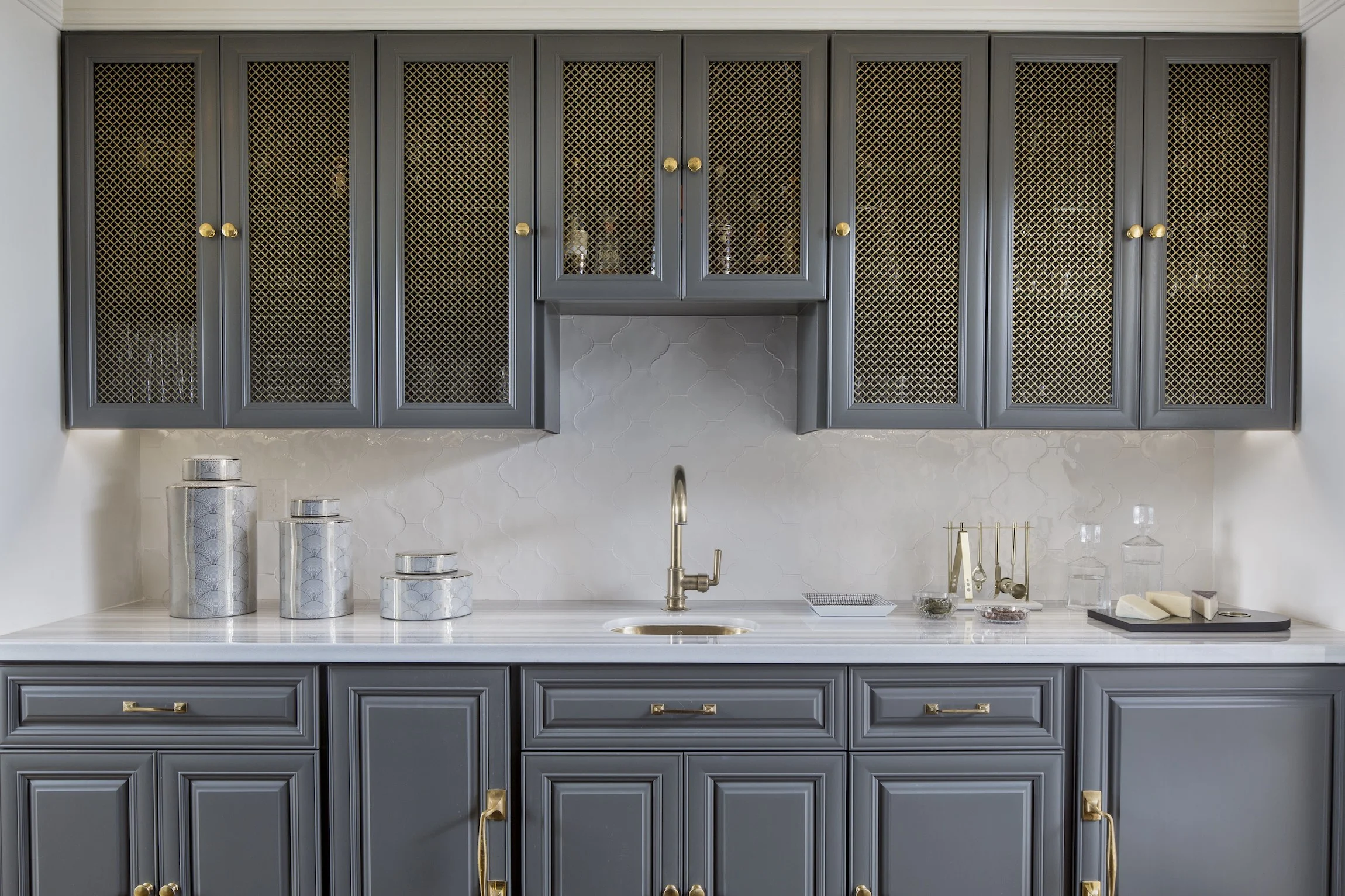 Massucco Warner is a full service interior design and decoration firm serving the Los Angeles and Seattle residential areas. Including: Larchmont, Windsor Square, Hancock Park, Beverly Hills, Bel Air, Hidden Hills, Pacific Palisades, Malibu, Holmby Hills, Montecito, Newport, and Santa Barbara. As seen on Open House TV, this classic, traditional Beverly Hills home designed by Massucco Warner features colorful, fresh interiors with custom furnishings, bold patterns, and quatrefoil accent chairs. It also features a sleek grey butlers pantry bar with brass accents, a bright orange chevron patterned ceiling in the powder room, and stunning quartz countertops in the kitchen. The master bathroom features marble countertops and a custom vanity and a custom man cave and sports room features.